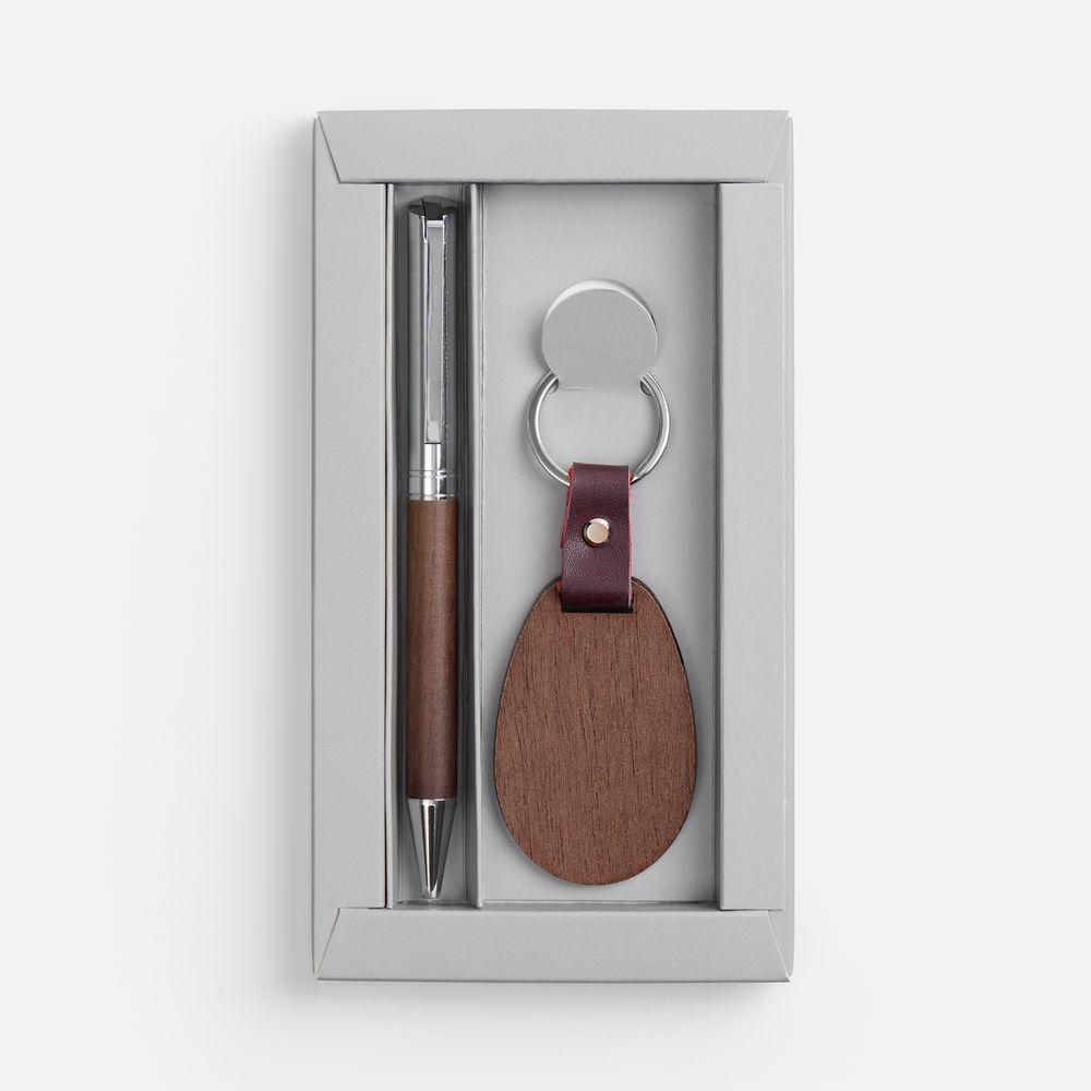 Шариковая ручка в деревянном корпусе и брелок из красного дерева в элегантном подарочном дуэте.