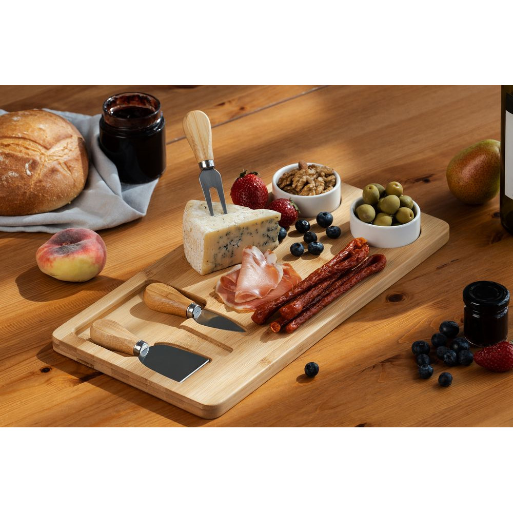 В набор входят доска из бамбука, два керамических соусника, вилка, листовидный нож для сыра твердых сортов, нож-лопатка для мягкого сыра.