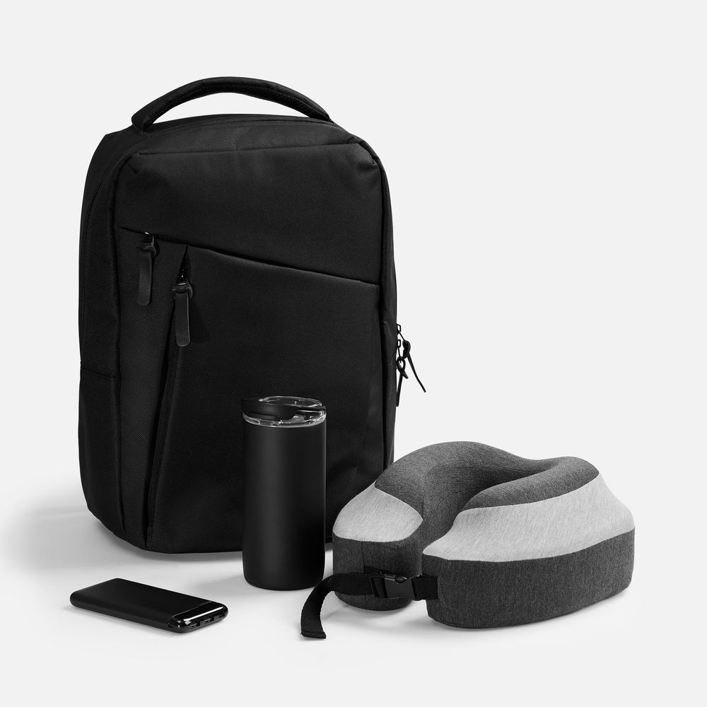 Этот стильный комплект включает в себя все необходимое для комфортных путешествий: практичный рюкзак, мощный внешний аккумулятор, уютную дорожную подушку и термостакан.
