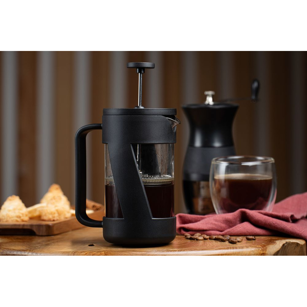 Френч-пресс подходит для заваривания как чая, так и кофе. Пластиковый каркас защищает колбу от повреждений и не дает обжечься. Колба из корпуса френч-пресса не вынимается. Емкость 600 мл.