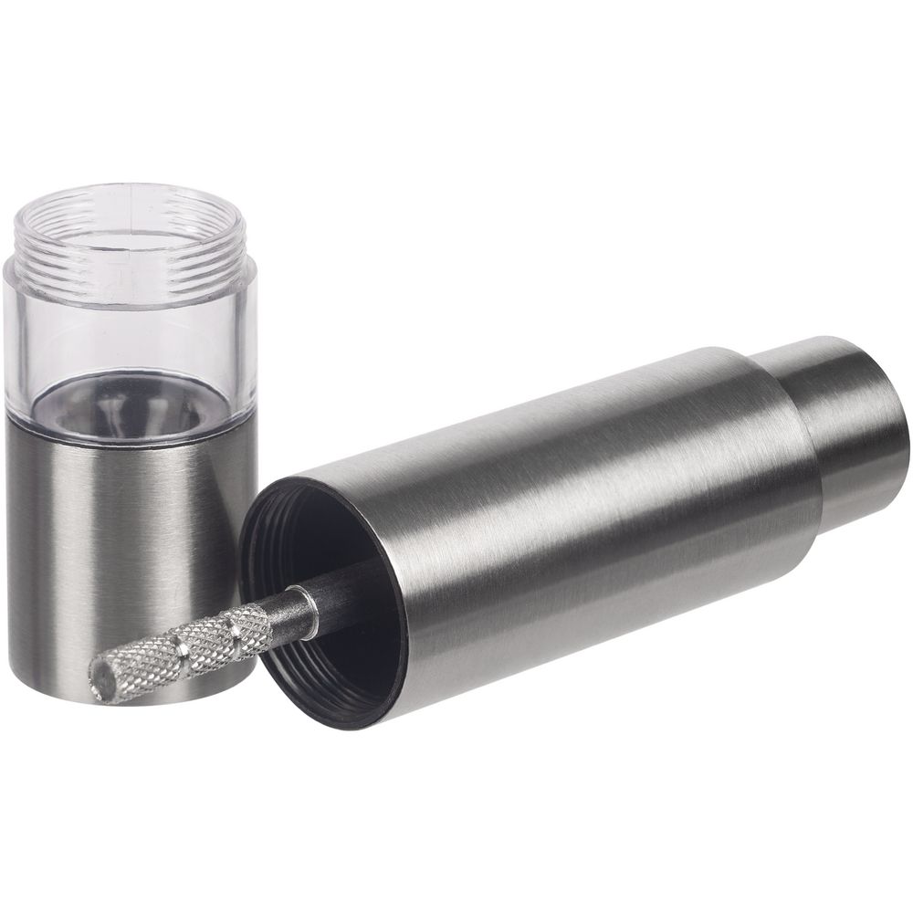 Компактная ручная мельница с пружинным механизмом и металлическими жерновами.