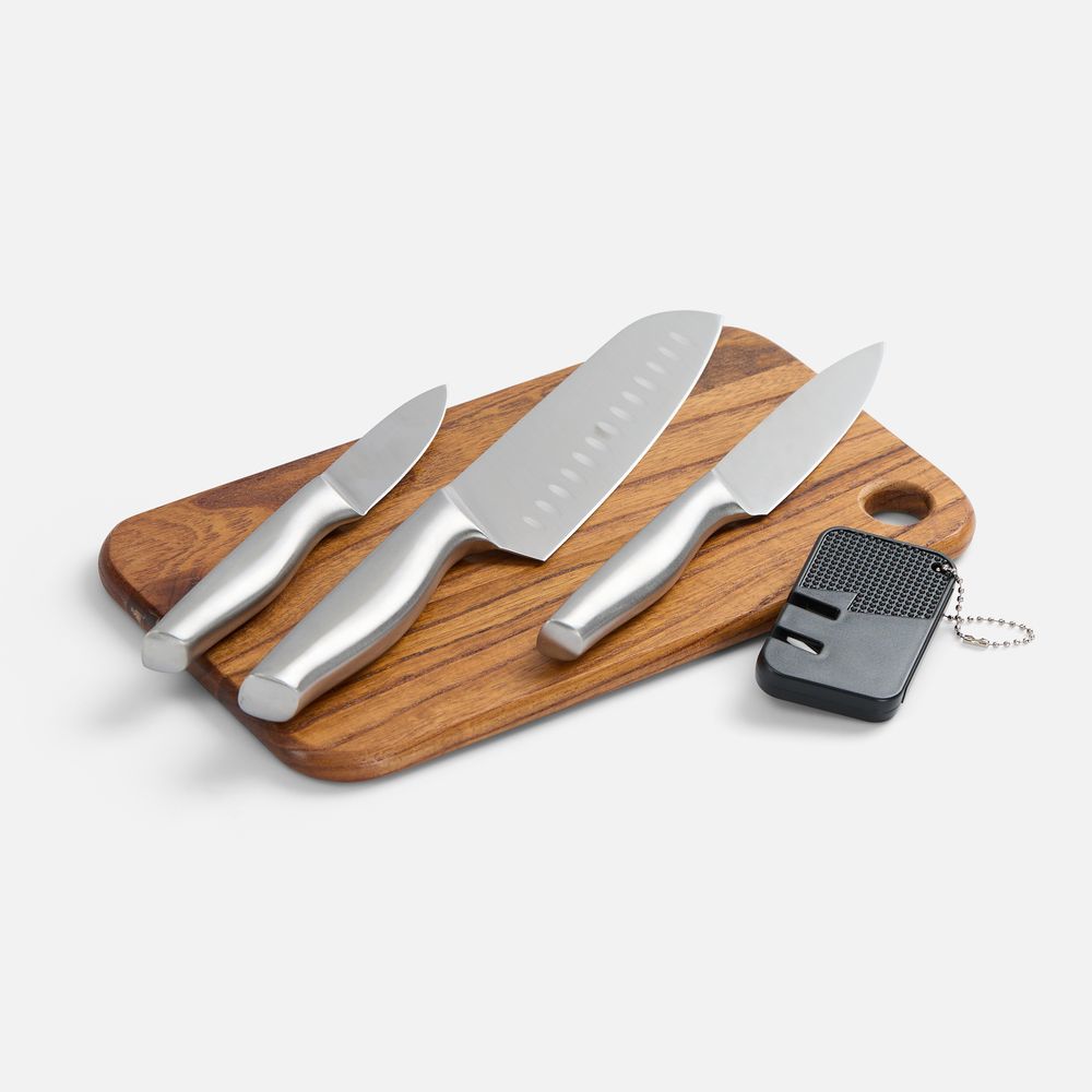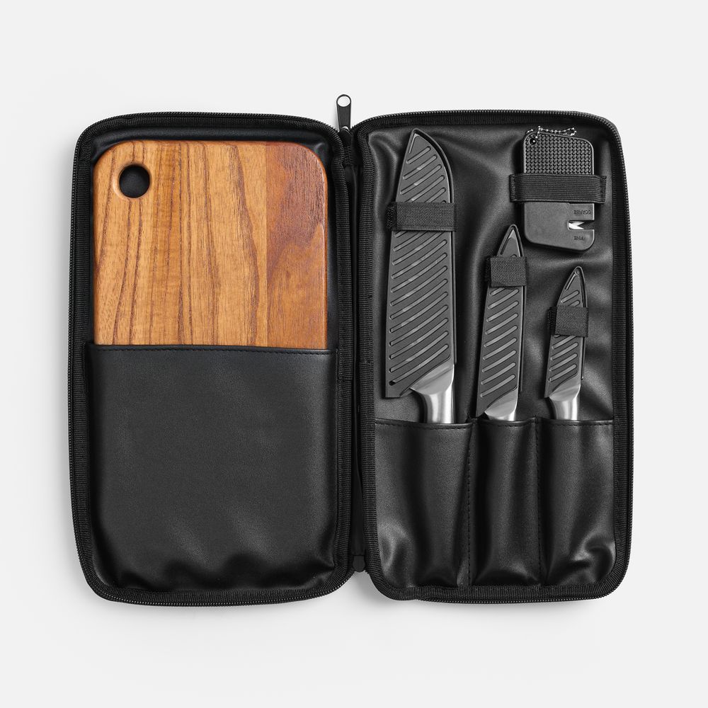 Этот компактный и стильный набор аккуратно упакован в лаконичную сумку и всегда готов к действию. Три ножа со сбалансированными лезвиями и прочная деревянная доска — персональный арсенал для любителей мясных блюд. Можно забыть про неудобства и хаос: с Meateam на пикнике мясо будет под контролем профессионала.