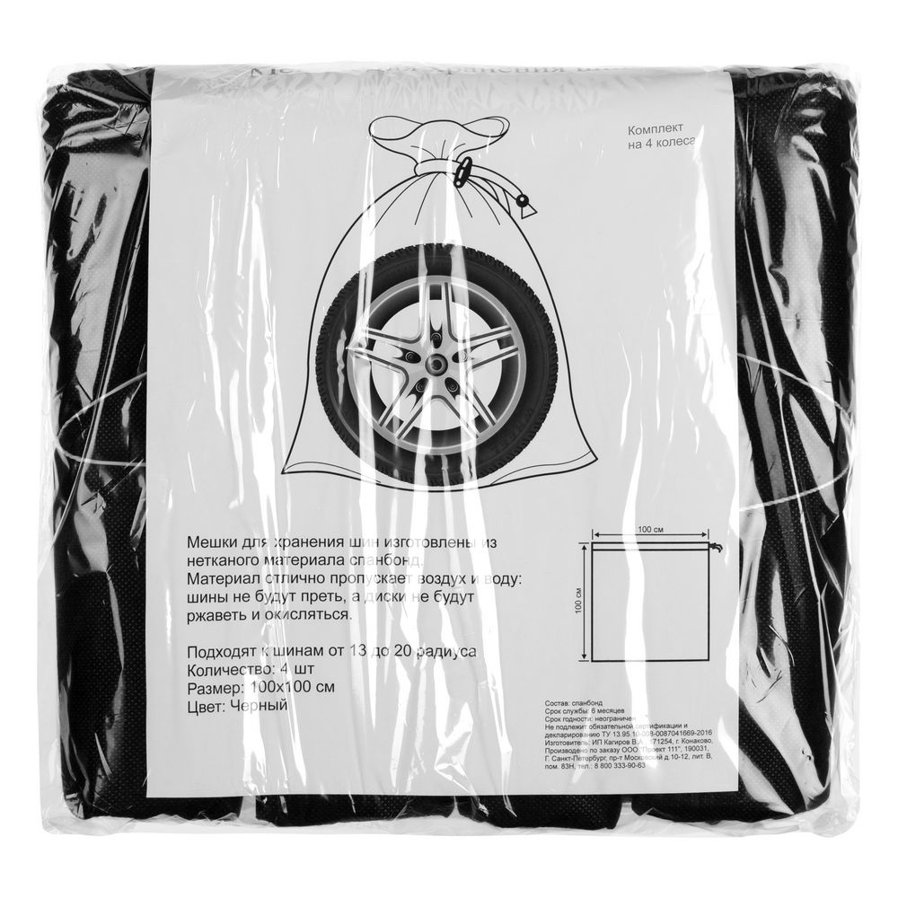 Мешки изготовлены из спанбонда — прочного, устойчивого к истиранию нетканого материала, который отлично пропускает влагу и воздух. Благодаря этому шины не будут запотевать, а диски — окисляться или ржаветь.