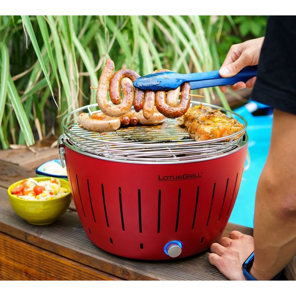 Угольный гриль округлой формы. Благодаря особой конструкции нижняя часть гриля не нагревается, его можно размещать даже на чувствительных поверхностях.