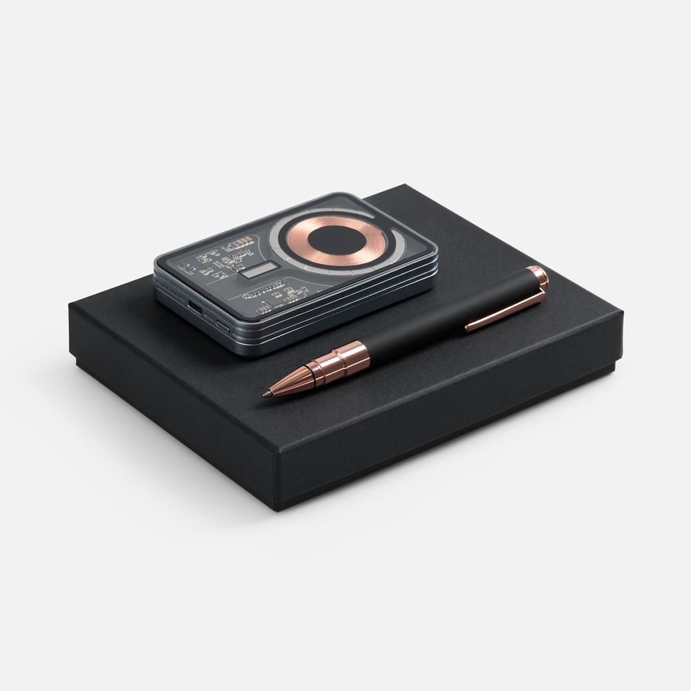 Необычный беспроводной аккумулятор Cooper Ergo и увесистая ручка Kugel Rosegold составляют вместе идеальный дуэт — с легким оттенком стильного стимпанка и намеком на прогрессивность. Набор станет идеальным подарком как для коллег, так и для руководителей, и покорит получателей оригинальностью и новизной исполнения.