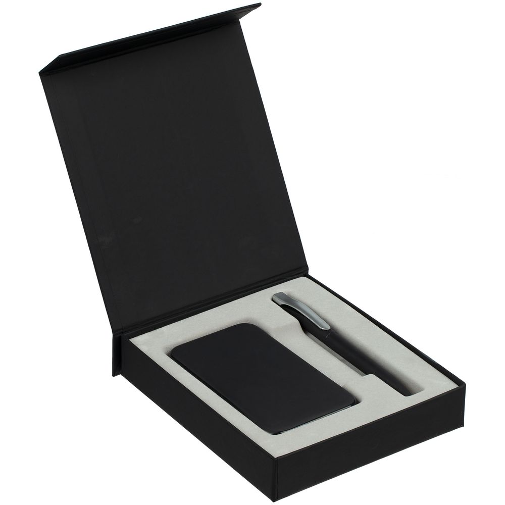 Подарочная коробка для аккумулятора 12,3х7,1х1 см и ручки 14,5х1,5х0,8 см с крышкой на магните и флокированным ложементом.