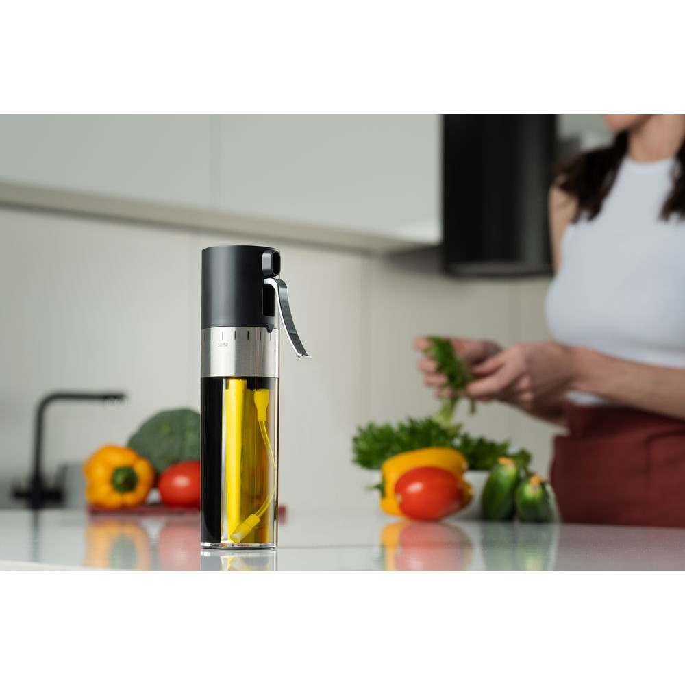 Спрей-дозатор Spatter позволяет контролировать количество используемого масла и уксуса при приготовлении блюд. Благодаря поворотному механизму на крышке можно использовать жидкости по отдельности, либо же смешивать в разных пропорциях.Емкость: 50 мл для масла, 50 мл для уксуса.