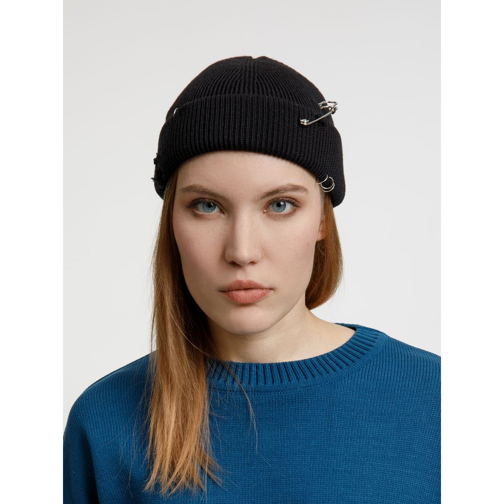 Однослойная шапка бини с рваным отворотом и металлическими аксессуарами для дерзких образов в любом возрасте. Яркий и запоминающийся акцент в стиле гранж.